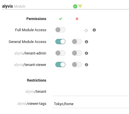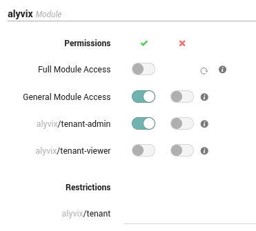 The privilege of a Tenant Admin role is granted to users with the General Module Access and alyvix/tenant-admin permissions, together with an alyvix/tenant restriction. For example, consider the case of a NetEye environment with a tenantA tenant. If you would like to grant a set of users the tenantA Tenant Admin role for Alyvix, you should enable the Alyvix module for tenant tenantA and configure a role in the Access Control as follows: